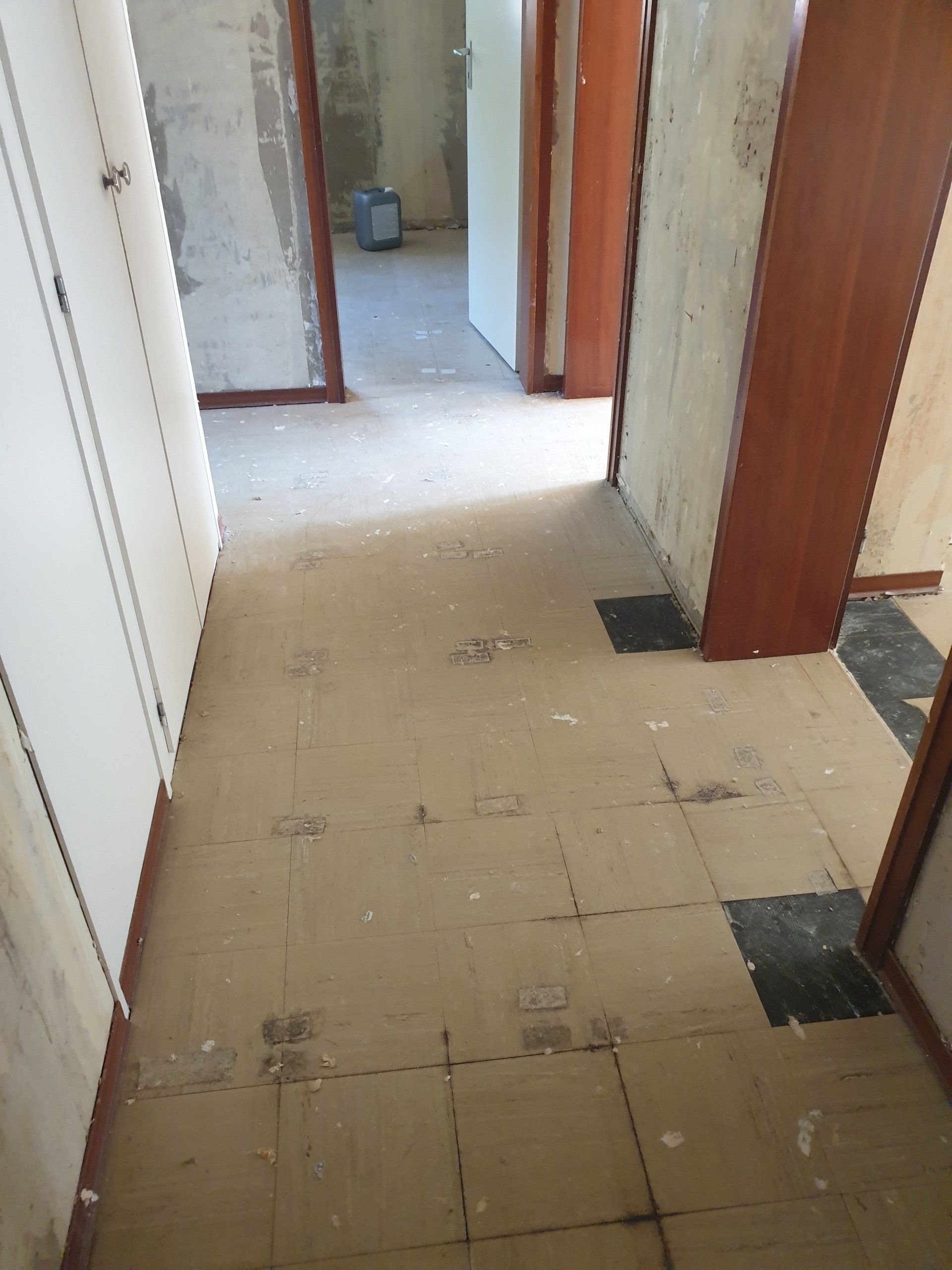 Vinyl-Asbestbodenplatten – umgangssprachlich auch Flexplatten genannt mit schwarzem Kleber darunter, das sind typische Beläge mit Asbest.